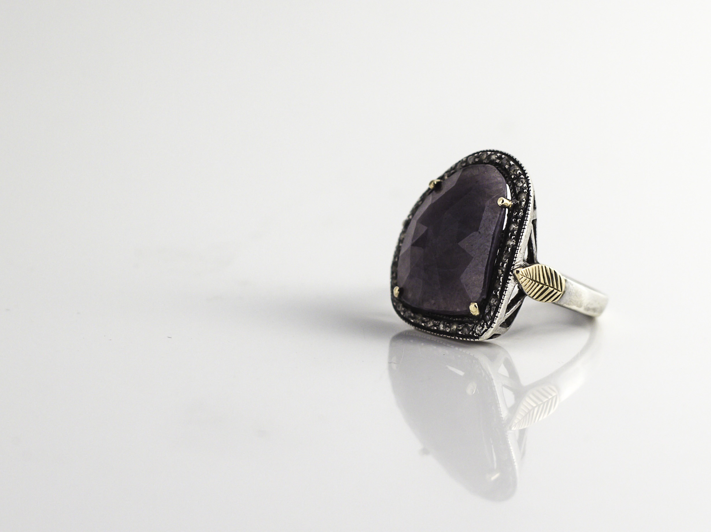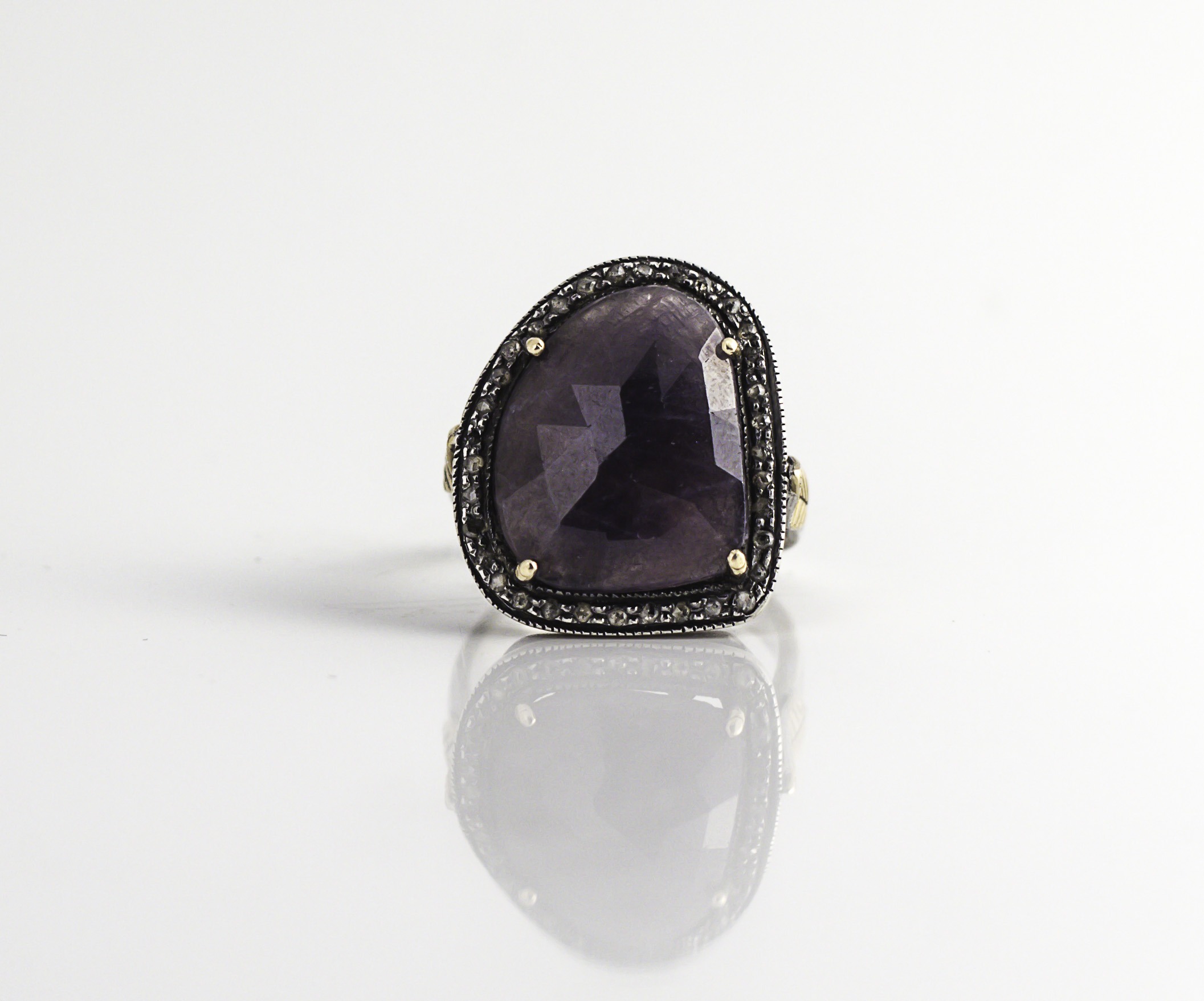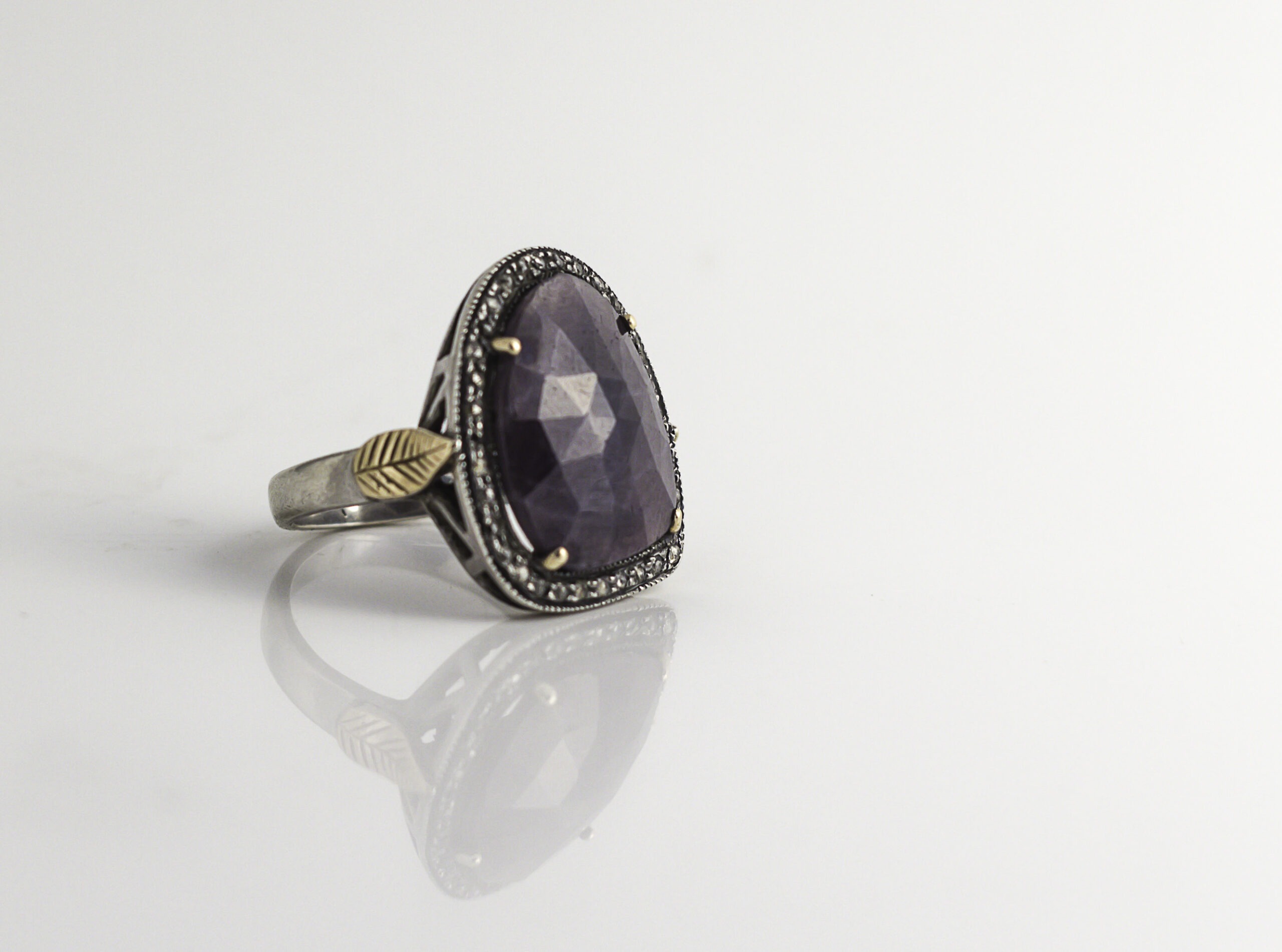 לטבעת אבן ספיר מרכזית אסימטרית בצבע סגול והיא מוקפת ב – 32 יהלומים אפורים.