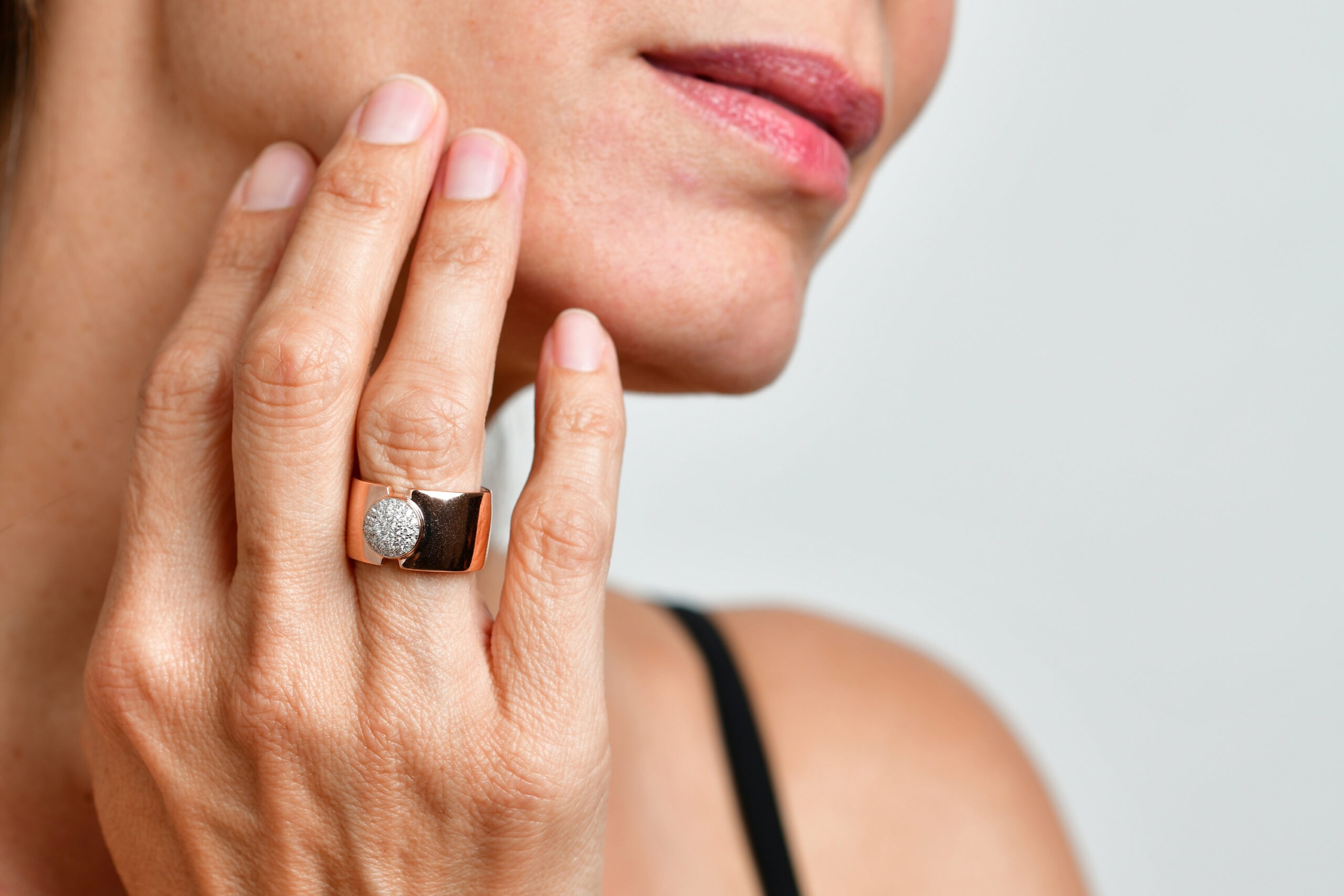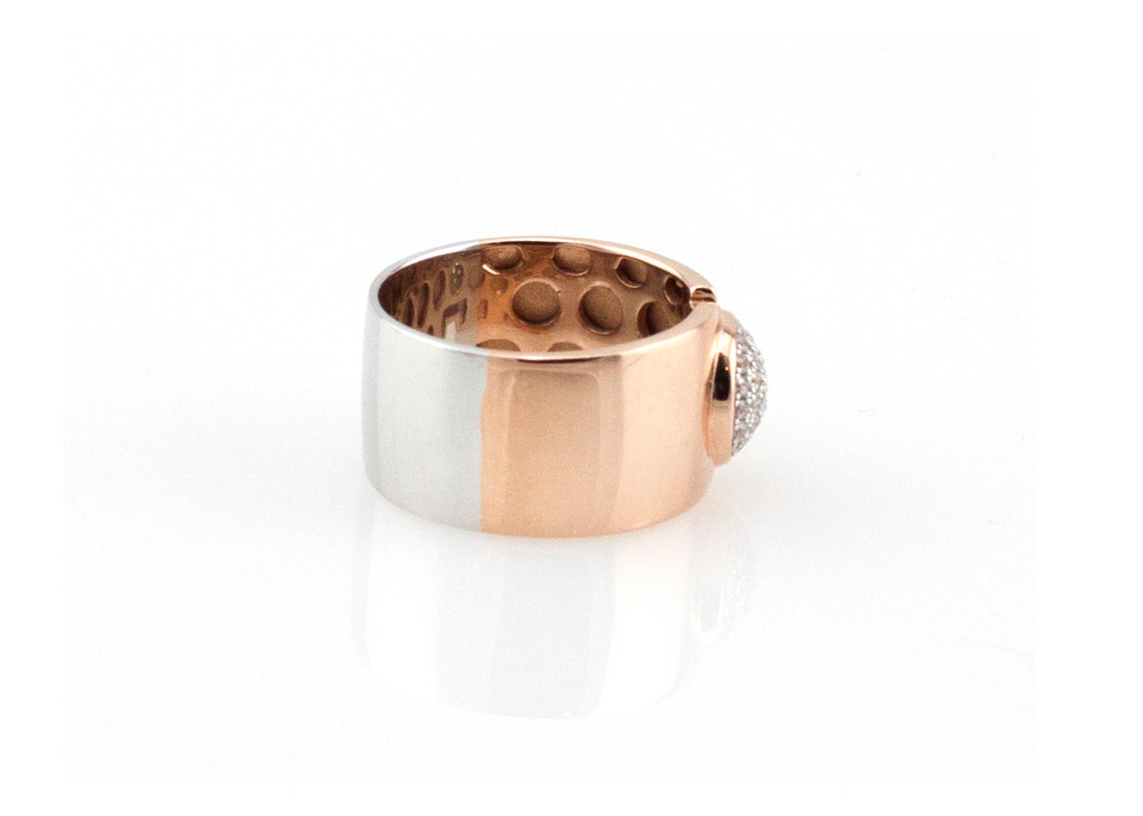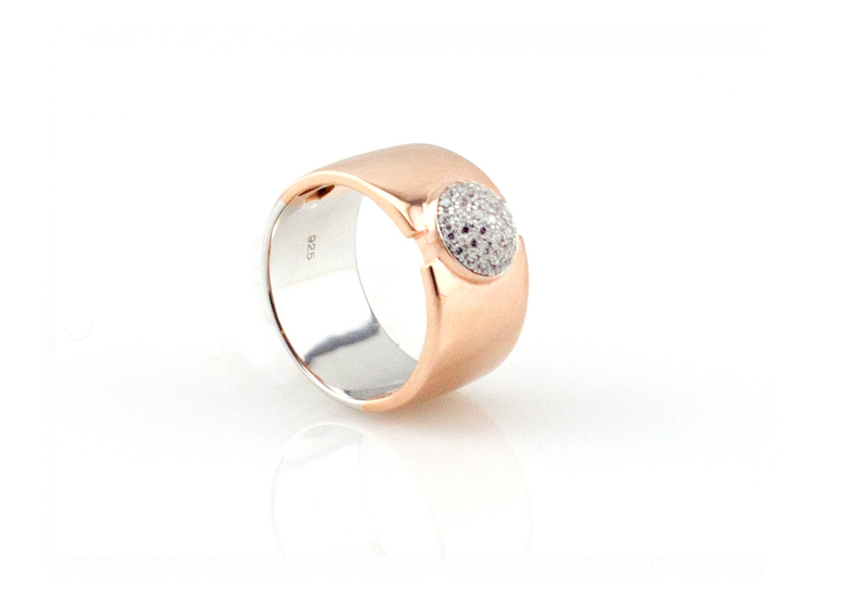 טבעת כסף רחבה בציפוי זהב אדום עם עיגול משובץ זירקונים במרכזה.