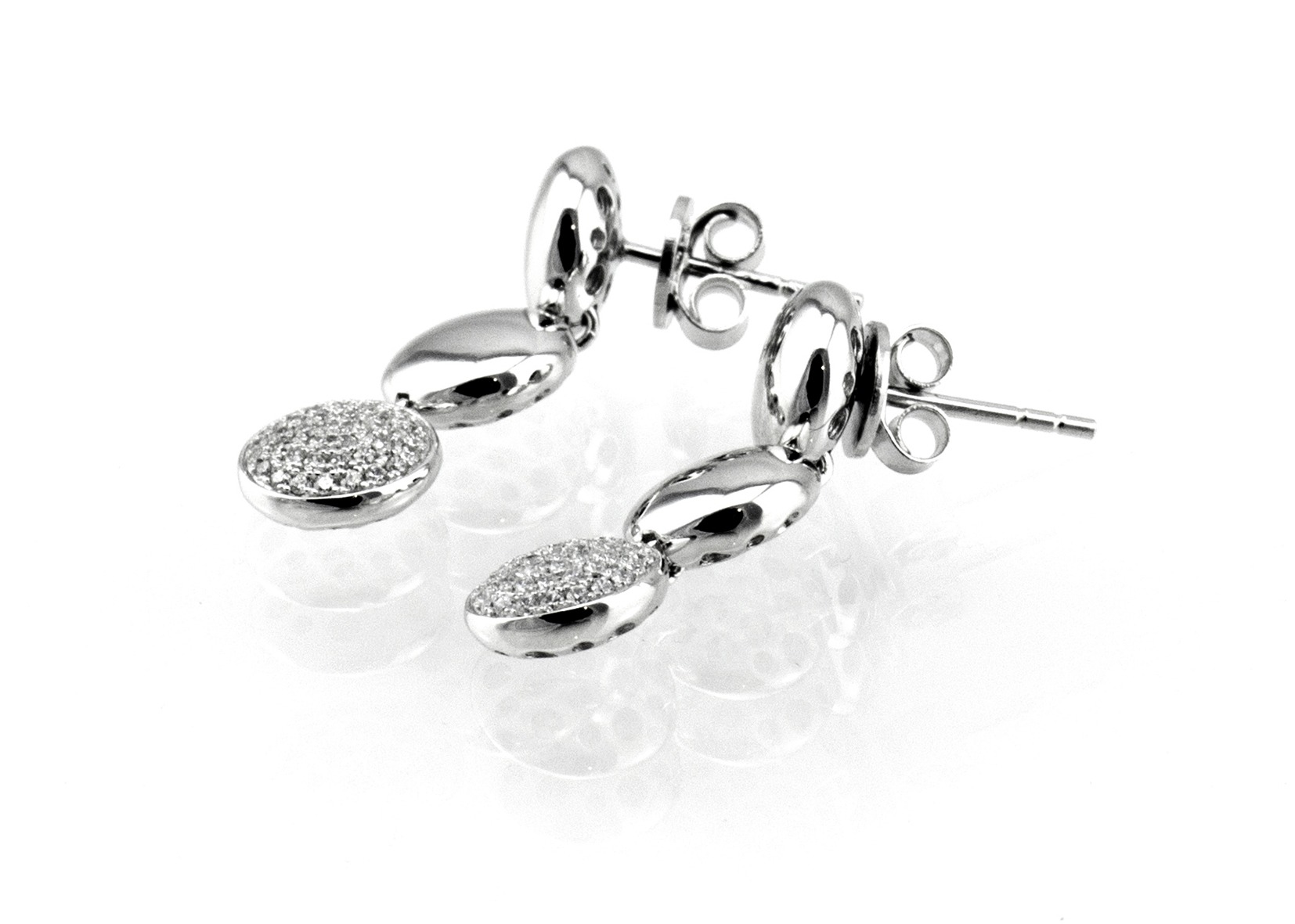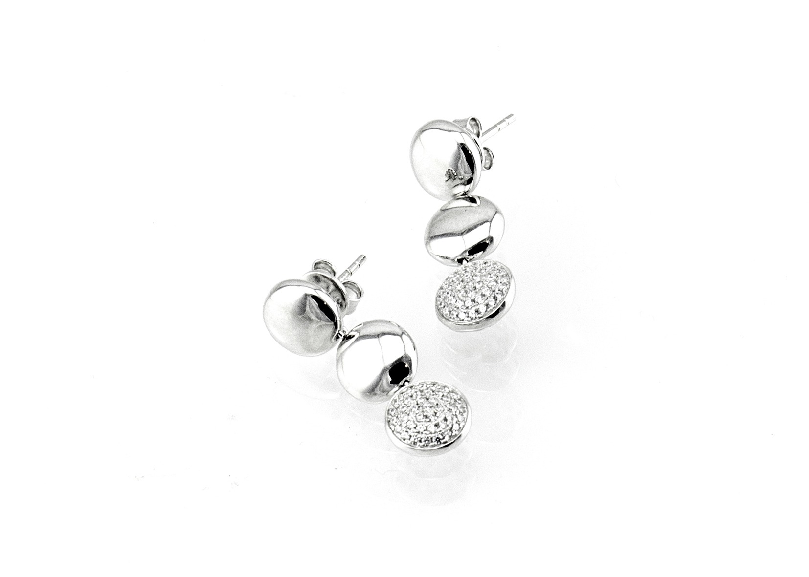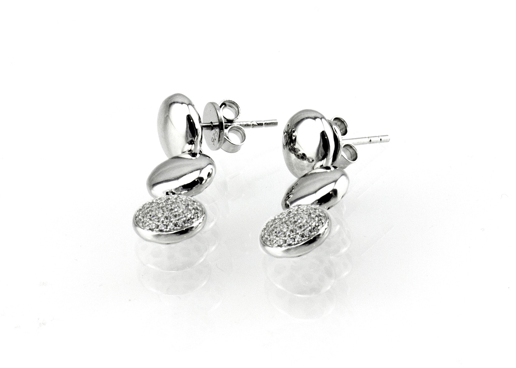 עגילי כסף מוארכים מצופים ברודיום ליצירת מראה של זהב לבן. העגילים מחוברים לאוזן באמצעות מתלה פין ומימנו משתלשלים שלושה עיגולים בגודל זהה כאשר העיגול התחתון משובץ כולו בזירקונים לבנים דמויי יהלום