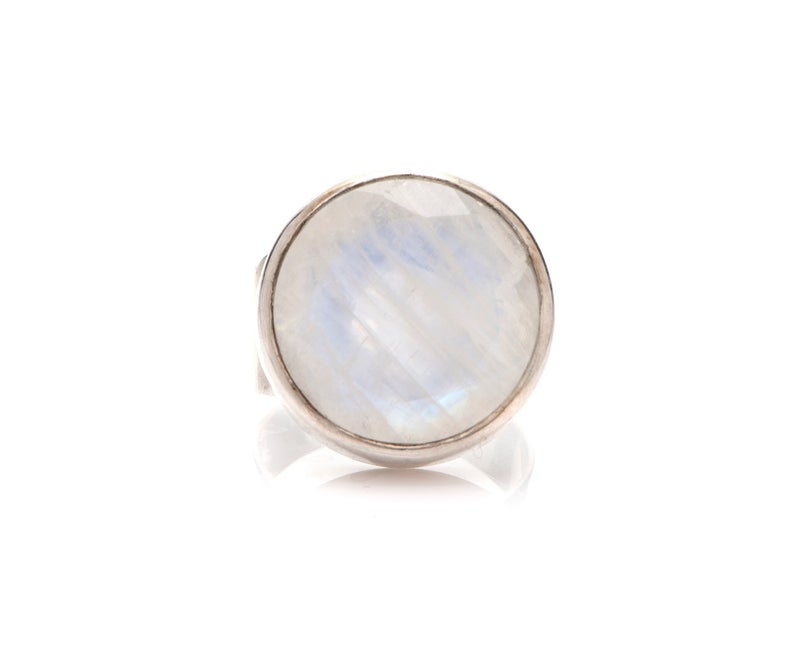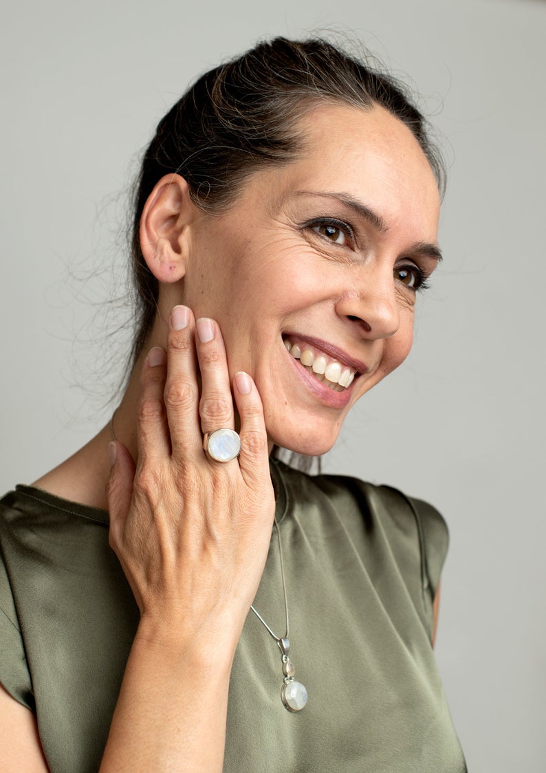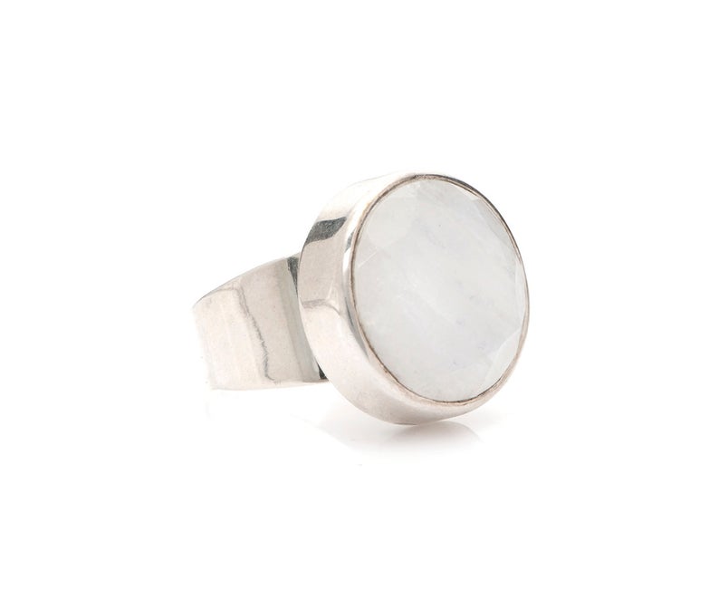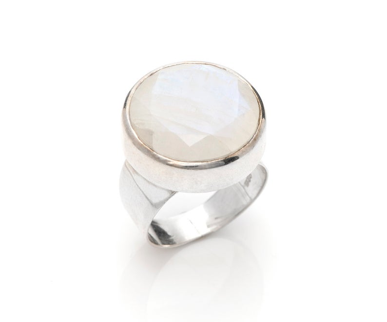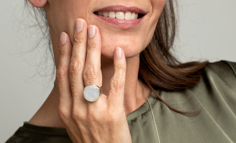טבעת כסף משובצת באבן מונסטון גדולה ומרשימה במרכזה.