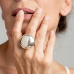טבעת כסף מוארכת אמנותית משובצת במקבץ גדול של אבני חן: סיטרין וגרנט.